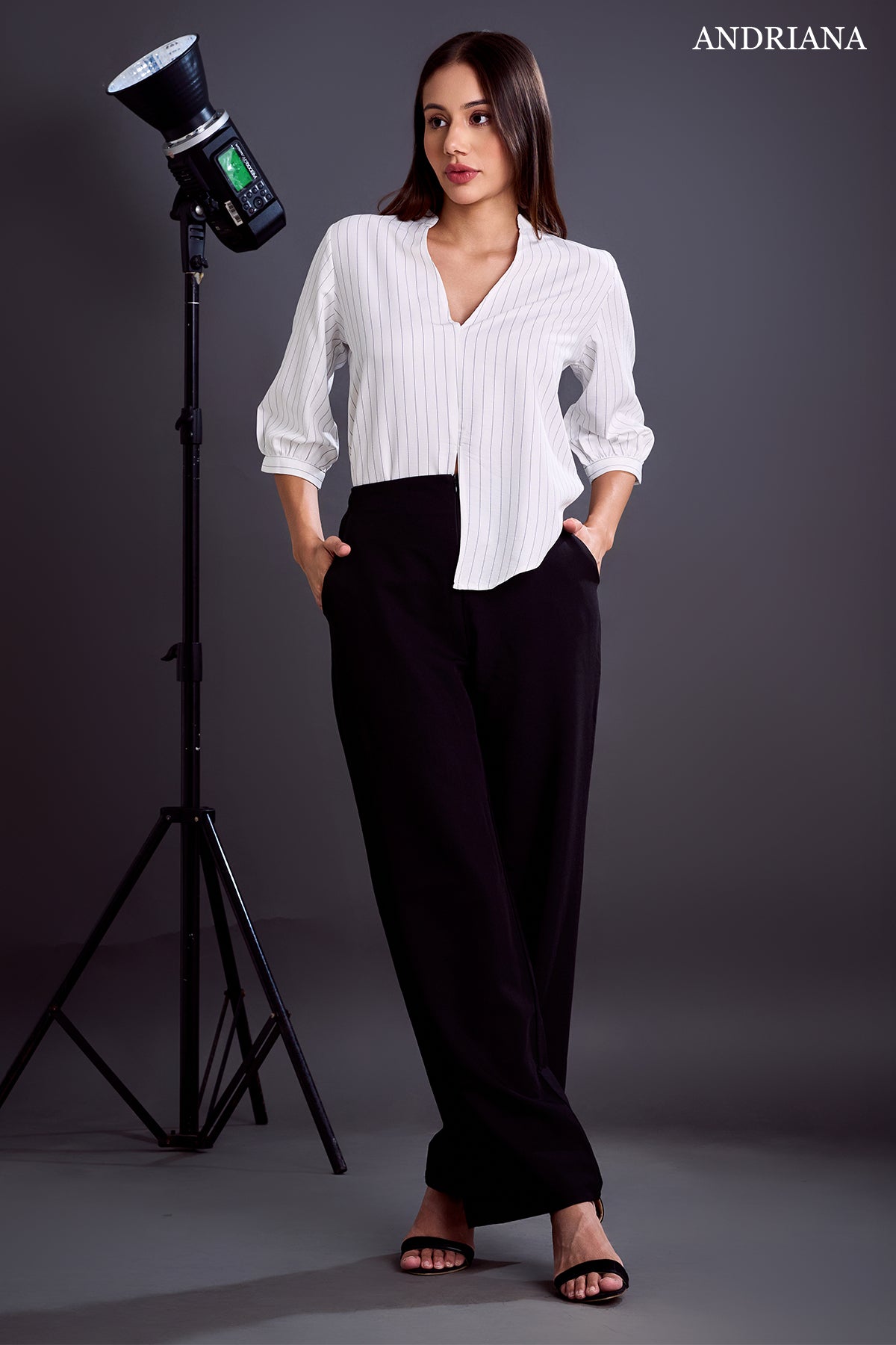 Add a relaxed edge to your office wear with the Andriana Loose Fit Stripe Blouse. Crafted for all-day ease, this top features a flowing silhouette and vertical stripes that subtly elongate your frame. The 3/4 sleeves provide a professional yet breezy touch – ideal for warm days or layering.