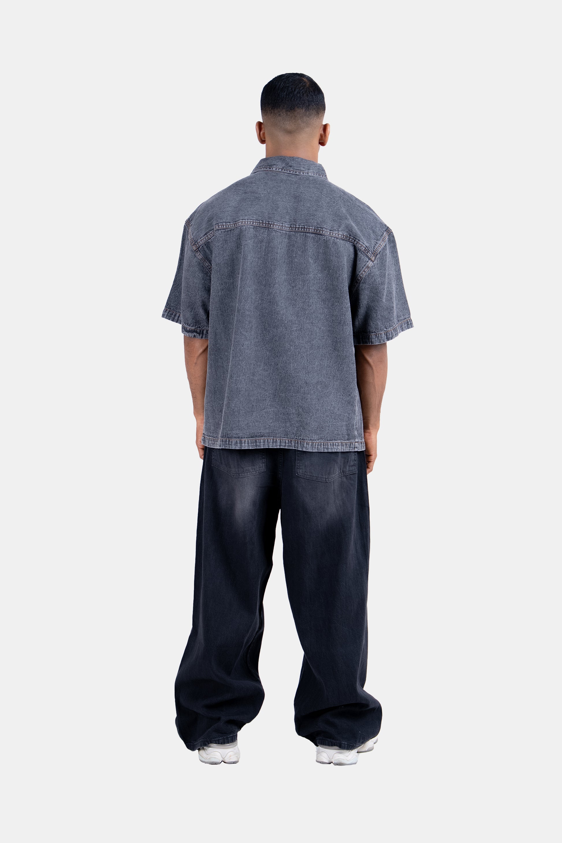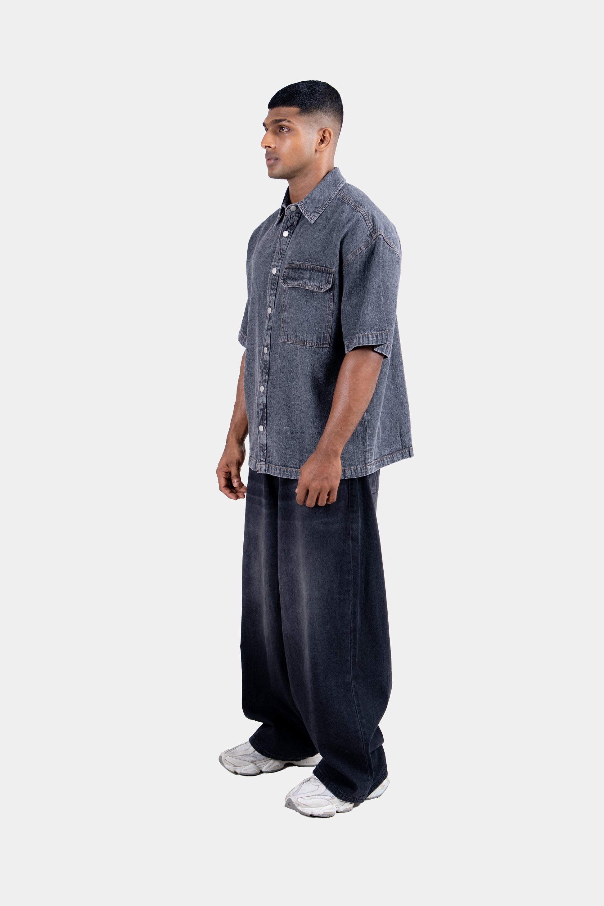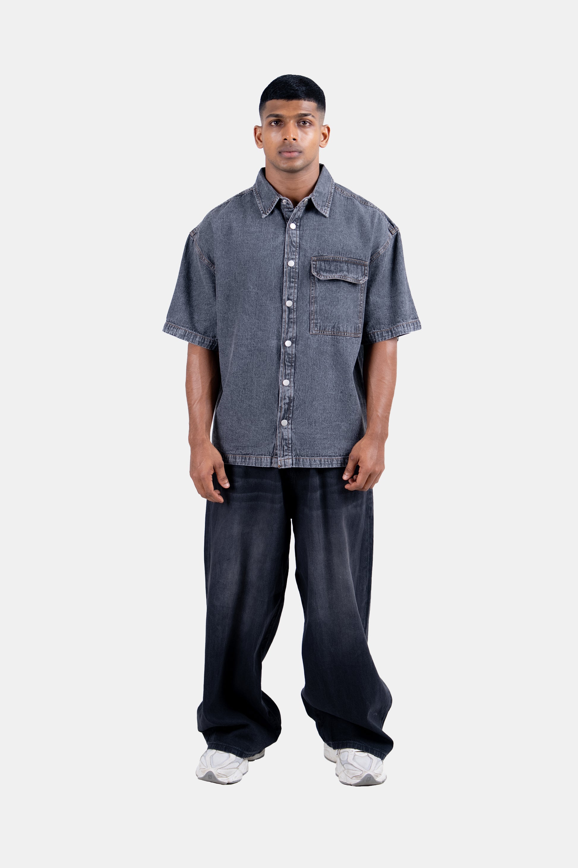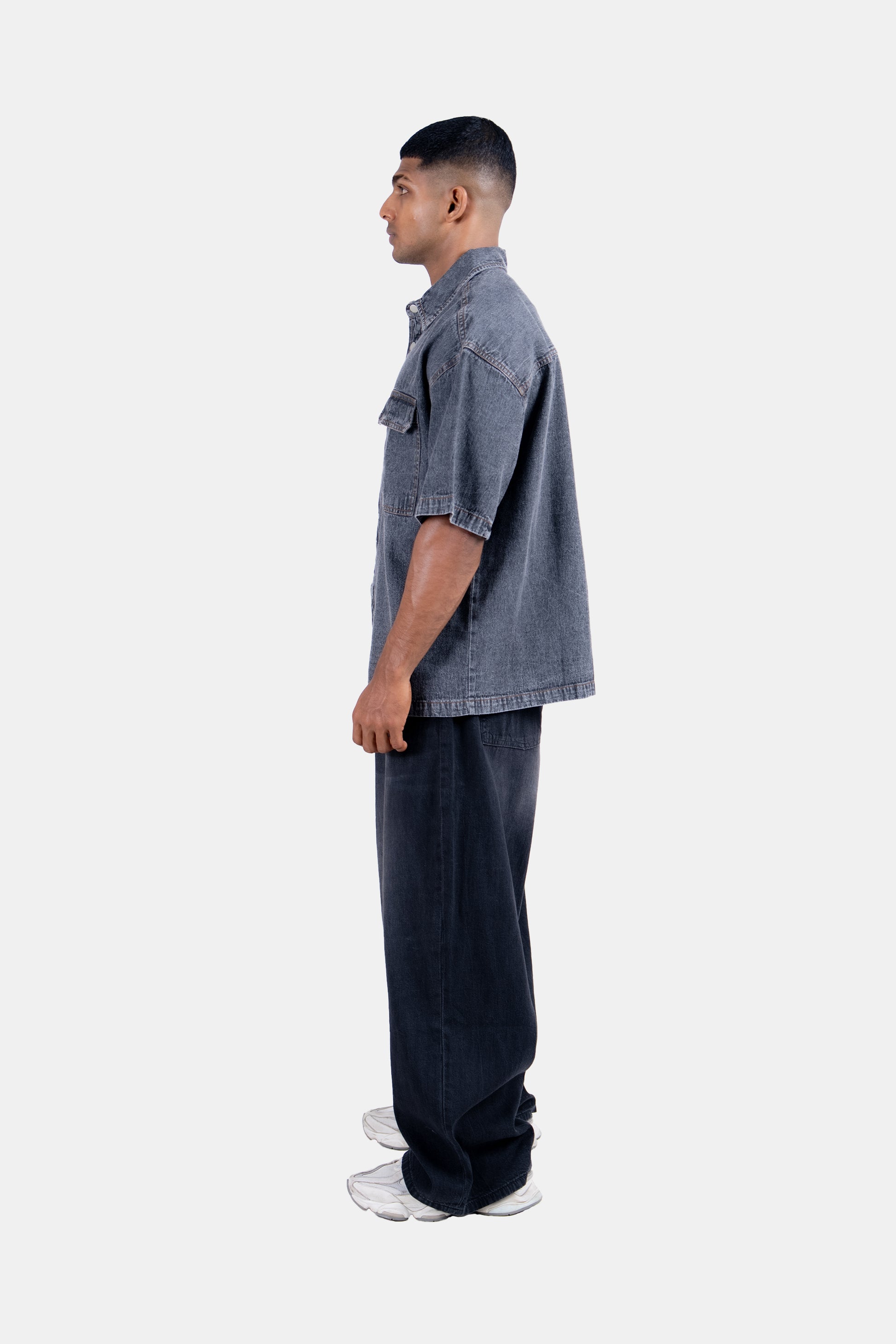 A sleek grey denim shirt with a regular fit, designed for casual and smart-casual looks. A versatile wardrobe essential that balances style and comfort effortlessly.