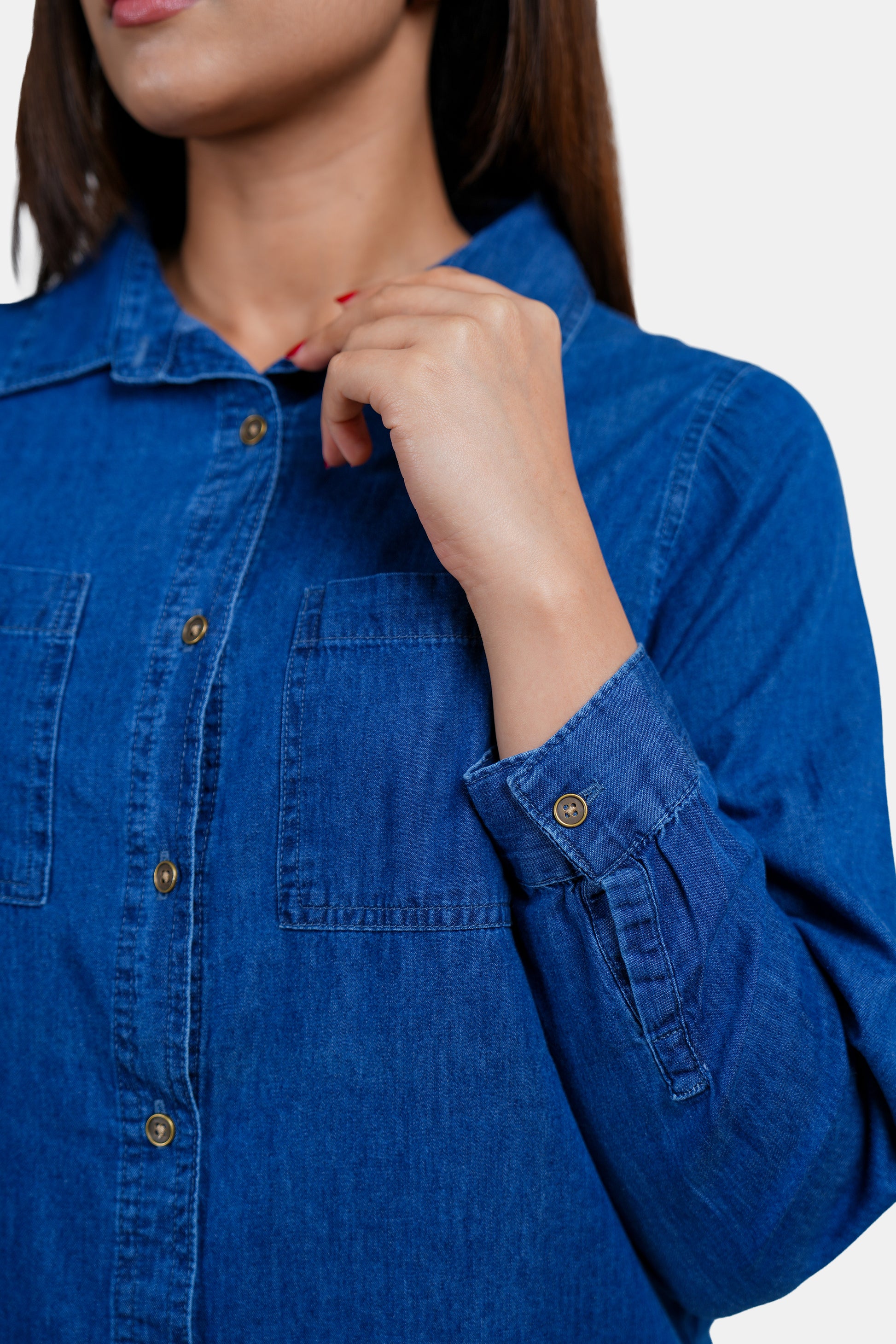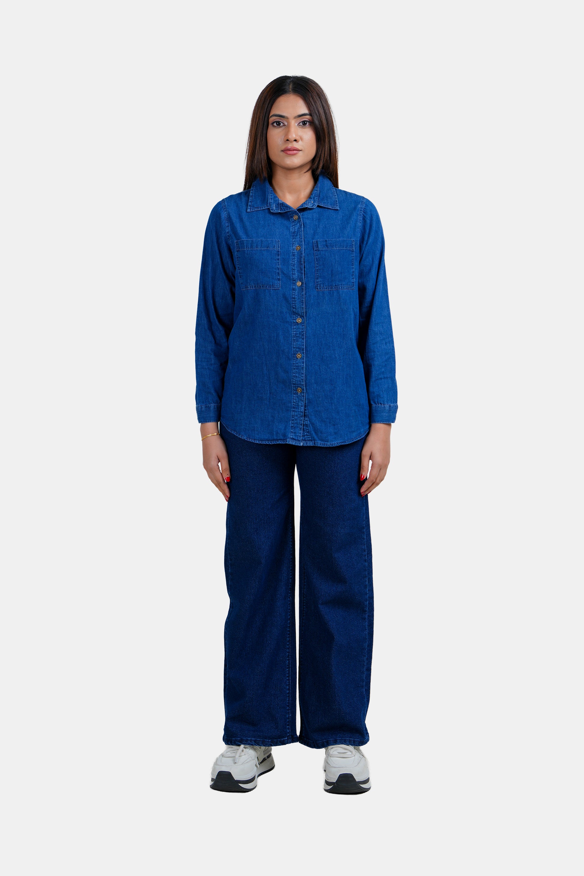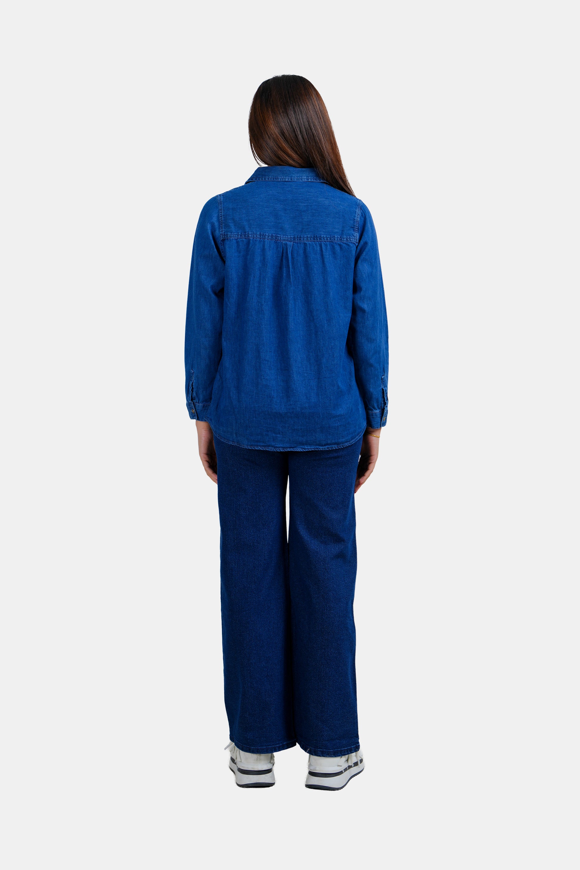 MODANO Ladies Denim Blouse MW-1843-1062, regular fit, long sleeve, plain solid denim design suitable for office and casual wear, made with soft and durable denim fabric for all-day comfort, available in Dark Blue, Mid Blue, Light Blue, and Blue (casual shirt style), sizes available XS (casual shirt), S, M, L, XL, ideal for pairing with trousers, jeans, or skirts, offers a clean stylish look for daily use.